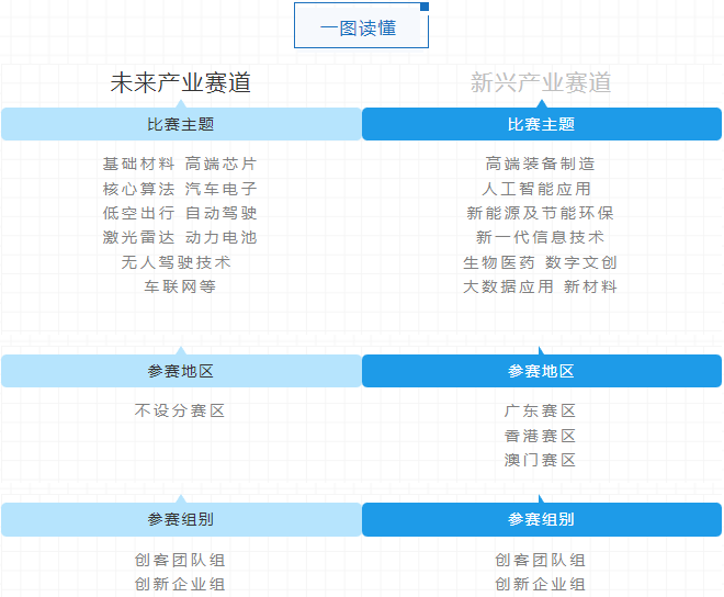 本次粤港澳大学生创新创业大赛积极响应国家发展规划,设置“未来产业新型移动出行专题赛”与“战略性新兴产业公开赛”两个赛道。每个赛道分为创客团队组和创新企业组,其中,未来产业专题赛不设分赛区;新兴产业公开赛设广东赛区、香港赛区、澳门赛区。