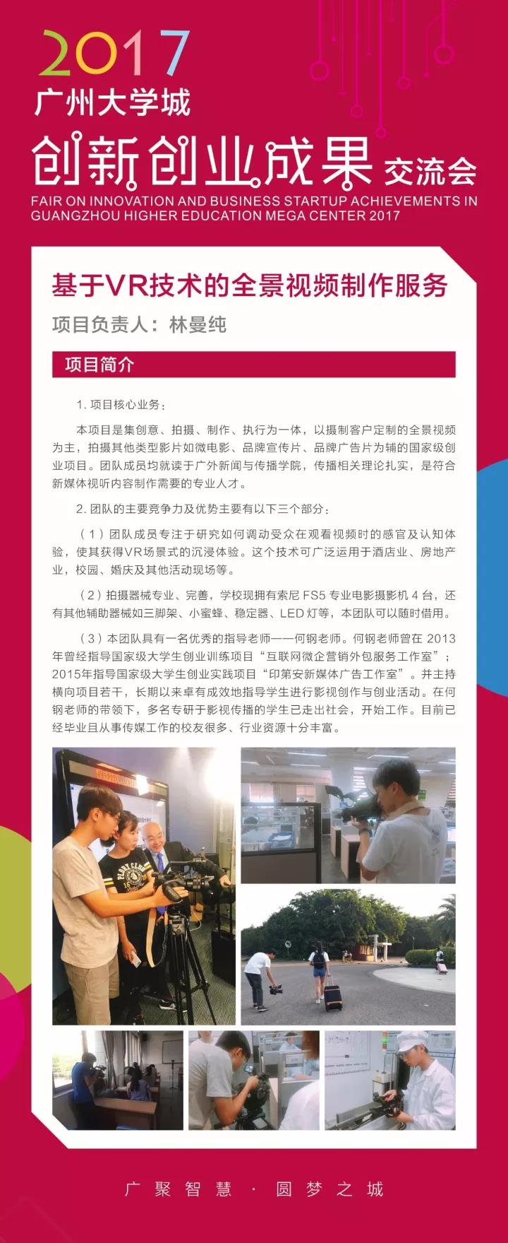 本次活动设有高校创新创业成果展示区等七个展示区,我校创业团队VR工作室、大咖工作室、广州留球子文化创意有限公司在我校展示区内进行创业成果展示,并向过往的来宾介绍项目及对接业务。