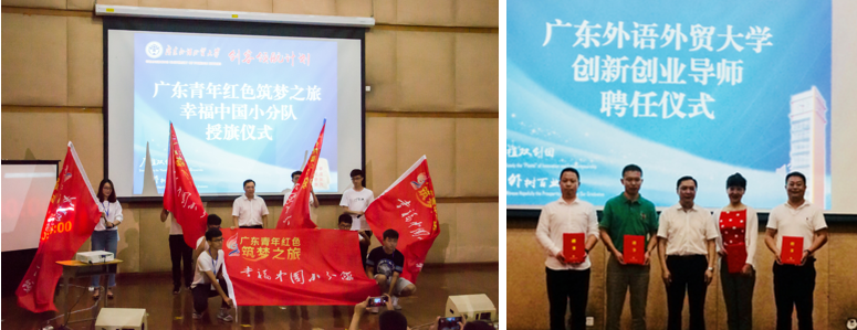 我校是“广东青年红色筑梦之旅·幸福中国小分队”(以下简称“小分队”)的牵头单位。刘海春向小分队活动承办组织“广外创业协会”和我校参加“青年红色筑梦之旅”专项赛道的3支创业团队授旗,并为李辰、施开亮、吴捷、刘国兴四位企业家颁发我校创新创业导师聘书。