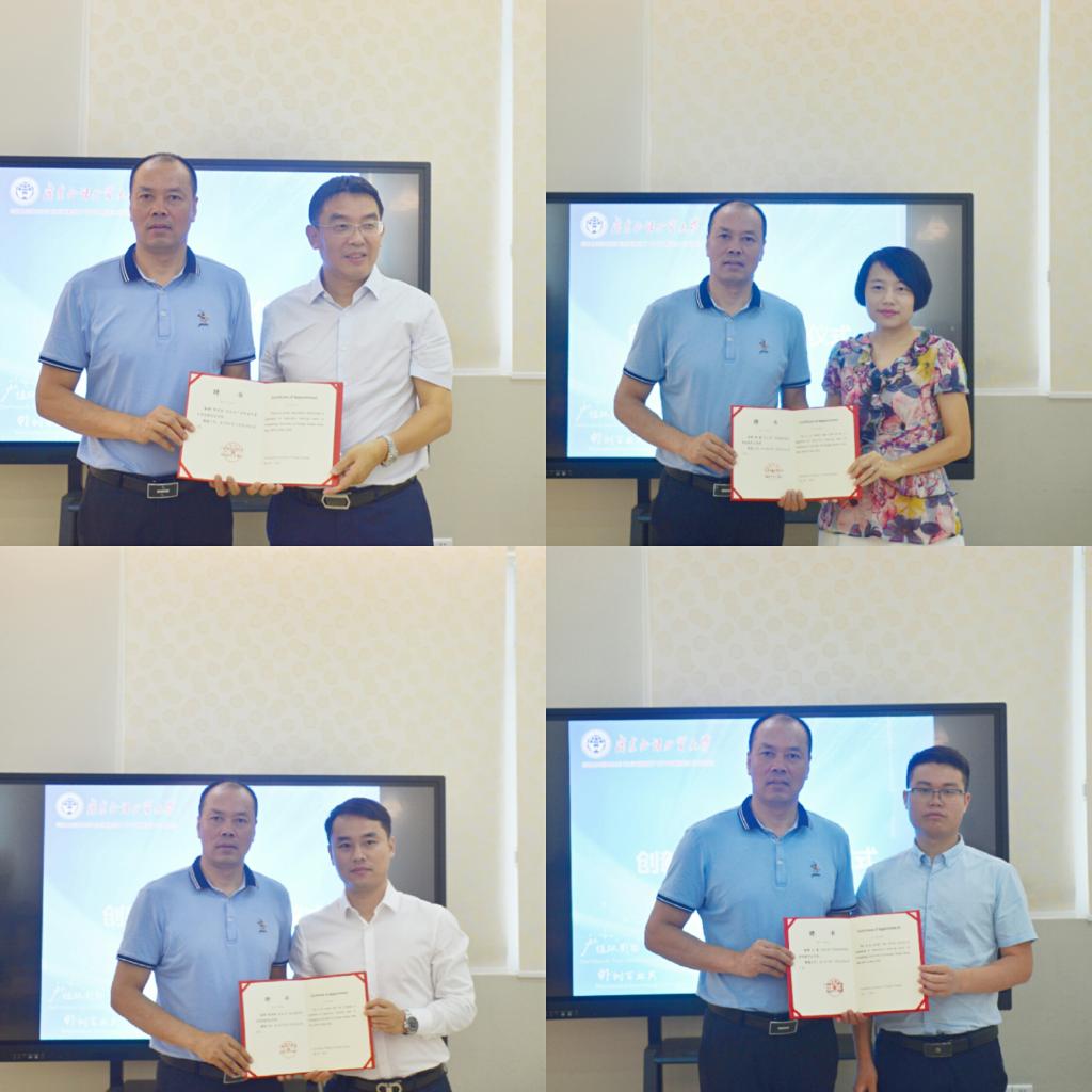 本次训练营的亮点除了丰富的学习内容外,还有国内外知名的创新创业导师。在开营仪式上,康院长为以下导师颁发广东外语外贸大学创新创业导师聘书,他们分别是:周宗佑(左上图)、陶媛(右上图)、胡晨辉(左下图)、王乾(右下图)。