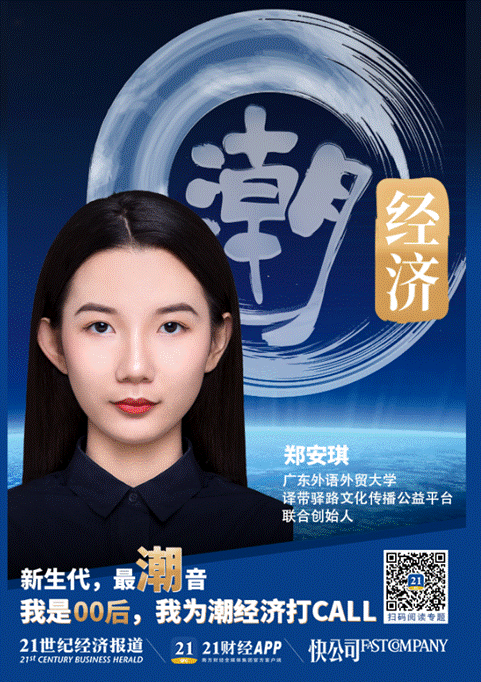 近日,21世纪经济报道对我校学生创业团队“译带驿路”多语言文化传播与扶贫公益平台进行报道,项目联合创始人郑安琪同学受邀参加“中国潮经济”项目,为潮经济打call。“中国潮经济”项目是由21世纪经济报道联合21财经APP、《快公司》杂志重磅推出,该项目作为一个观察窗口,持续关注潮人潮事,聚焦经济运行中的“潮”力量。郑安琪同学作为潮经济引领者之一,摸索着“潮”经济的脉络,唱响最潮音。这位00后新生代,这位充满热情的创业者,她用自己的行动,诠释着潮经济蓬勃的生命力。