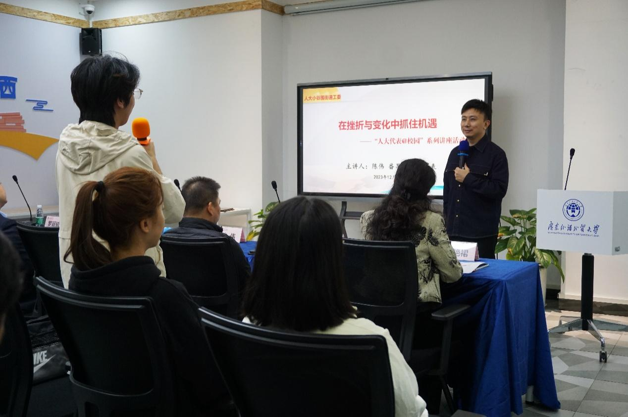 在随后开始的讲坛里,陈伟首先回顾总结了自己的创业历程。一开始,他们只是在学校创业实验室的学生团队,在得到淘宝认可并使用其团队产品之后,他们的公司快速发展。然而,随着市场的变化,他们也遭遇了资本寒冬和激烈竞争等困境。为了应对这些挑战,他们进行了许多调整,包括从传统的广告投放转向数字化营销,以及转型为产品决策营销建设计算的数据学习平台。这些改变让他们成功地应对了困境,并实现了业务的繁荣发展。陈伟表示,创业充满艰辛和不确定性,他向同学们强调,创业需要不断的创新和尝试,同时也需要灵活应对市场变化,只有这样,才能在竞争激烈的市场中立足并取得成功。