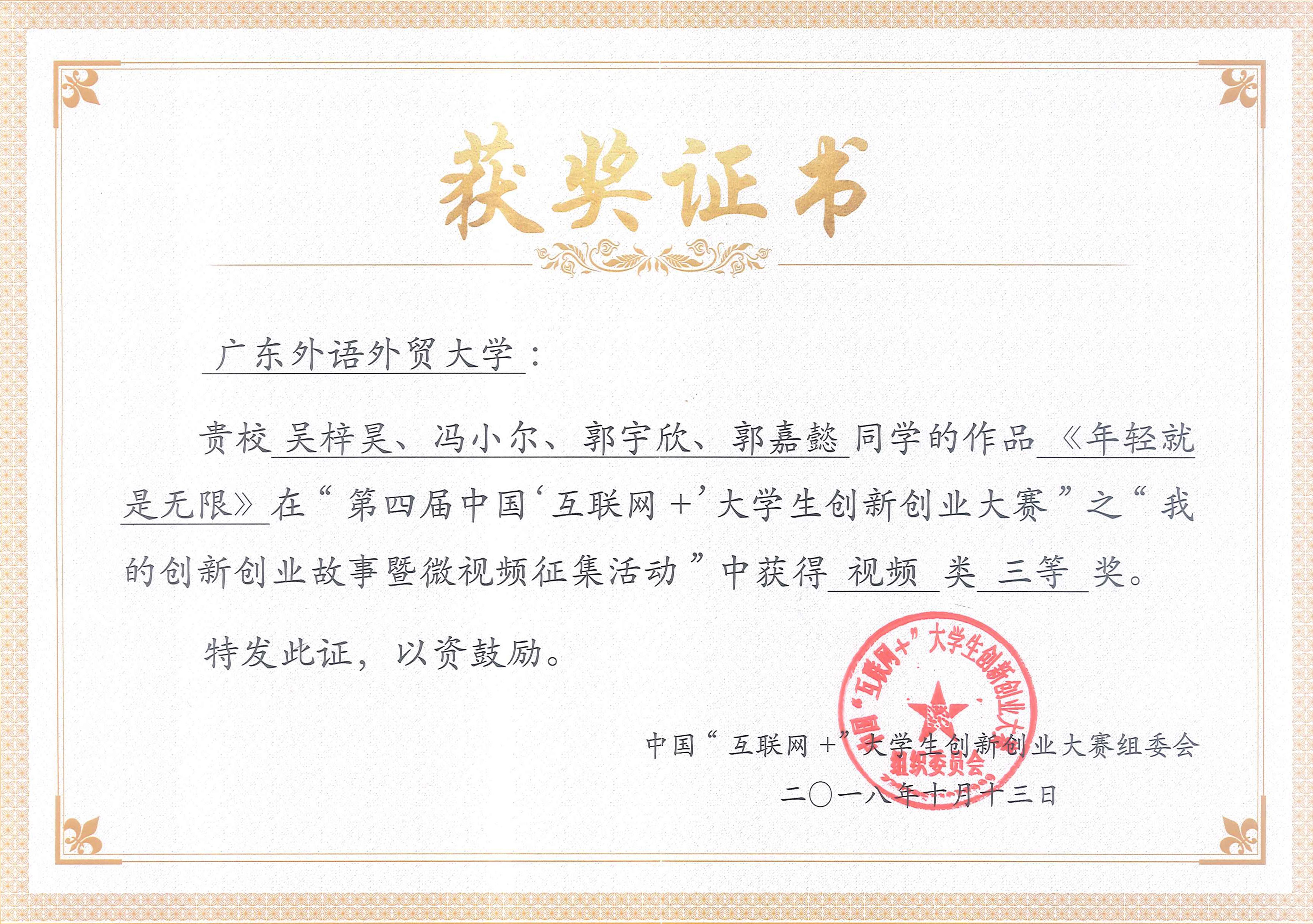 10月13日,第四届中国“互联网+”大学生创新创业大赛——“我的创新创业故事”暨微视频征集活动颁奖典礼在厦门大学举行。我校学生的作品《年轻就是无限》荣获视频类三等奖。