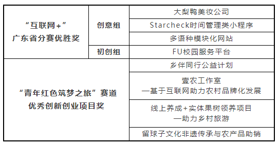 根据《广东省教育厅关于公布第四届中国“互联网+”大学生创新创业大赛广东省分赛获奖名单及第二届粤港澳大湾区大学生创新创业项目对接洽谈活动参与情况的通知》(粤教毕函〔2018〕36号),我校共8个学生创业团队获奖。具体名单如下: