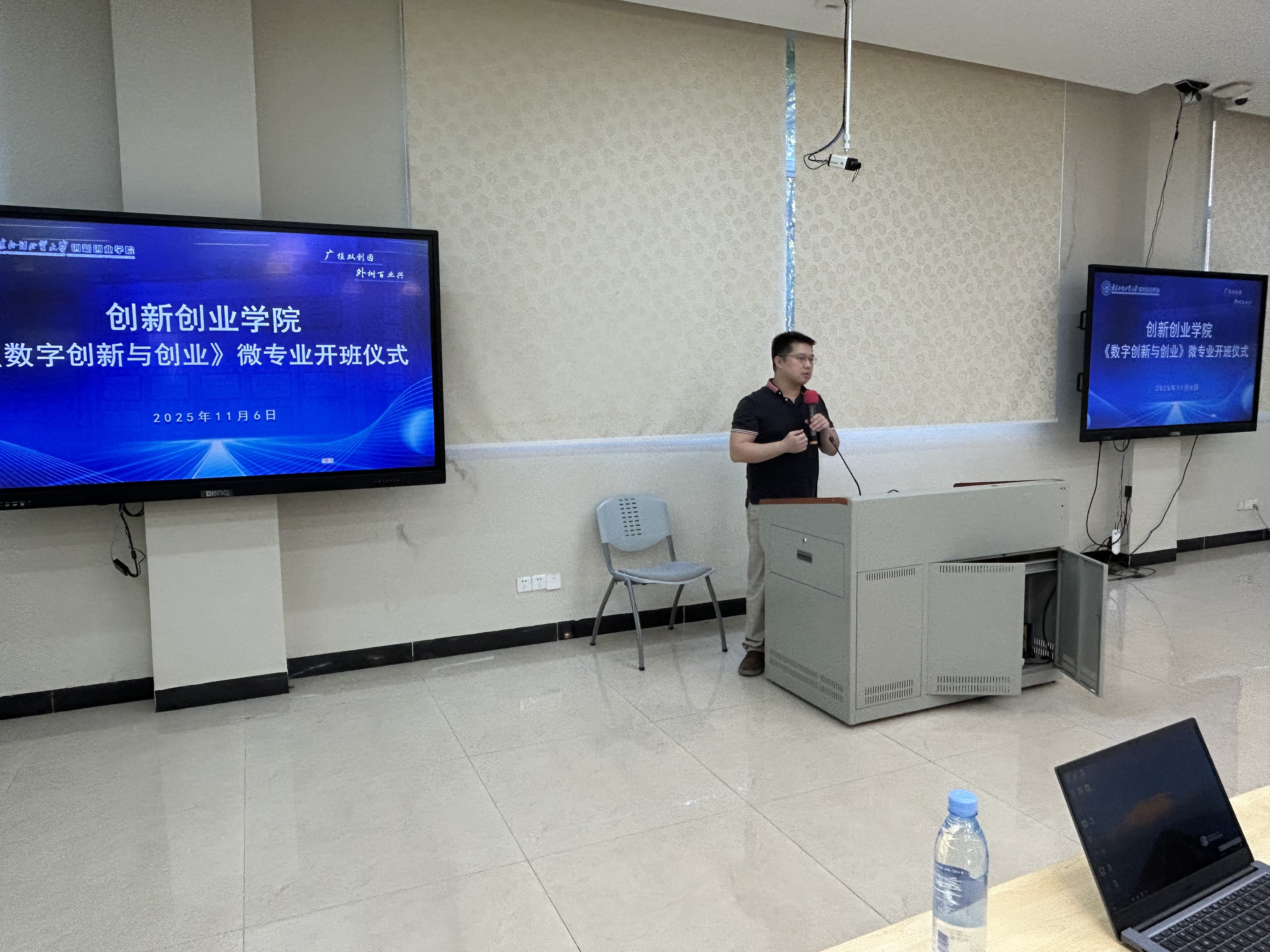 11月6日,广东外语外贸大学创新创业学院“数字创新与创业”微专业开班仪式在大学城校区创新创业I-Lab实验室隆重举行。创新创业学院常务副院长肖锋、创新创业学院副院长刘方龙出席仪式。来自两个校区的首届微专业学员齐聚一堂,共同开启一场融合数字技术与商业创新的学习之旅。