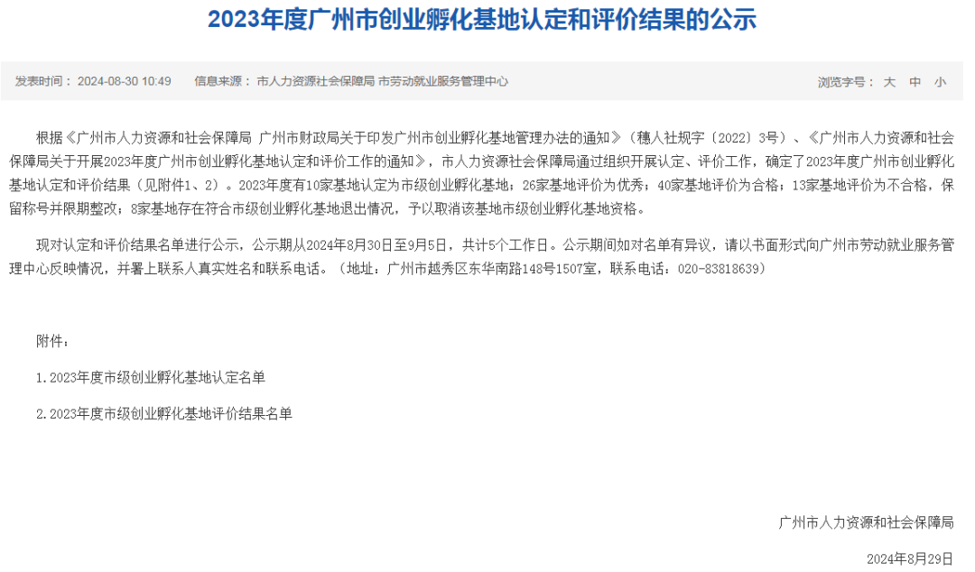 根据《广州市人力资源和社会保障局广州市财政局关于印发广州市创业孵化基地管理办法的通知》(穗人社规字〔2022〕3号)、《广州市人力资源和社会保障局关于开展2023年度广州市创业孵化基地认定和评价工作的通知》,市人力资源社会保障局通过组织开展认定、评价工作,确定了2023年度广州市创业孵化基地认定和评价结果。