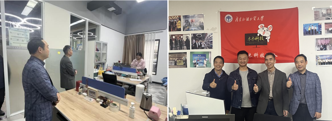 刘方龙向来访嘉宾介绍我校创新创业教育理念、场地管理、项目孵化、建设成果等情况,并带领李新春教授一行参观国家级实践基地各功能区域、与学生创业团队“木木科技”“掘金巴西”调研交流。