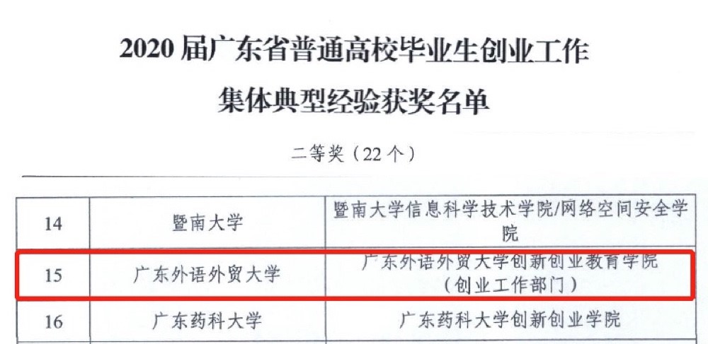 近日,接《广东省教育厅关于公布2020届广东省普通高校毕业生就业创业工作典型经验集体和个人获奖名单的通知》(粤教毕函〔2021〕5号),创新创业教育学院获评广东省普通高校毕业生创业工作集体典型经验二等奖,商学院沈长霞、马克思主义学院朱倩渝、创业学院肖喜明获创业工作典型经验个人奖。