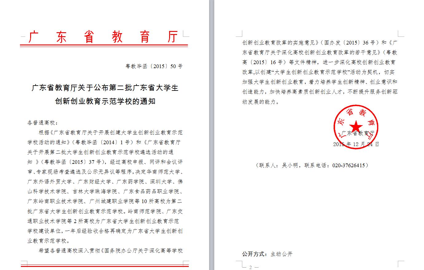 2015年12月24日,省教育厅下发了《广东省教育厅关于公布第二批广东省大学生创新创业教育示范学校的通知》(粤教毕函〔2015〕50号)。我校获评广东省大学生创新创业教育示范学校。