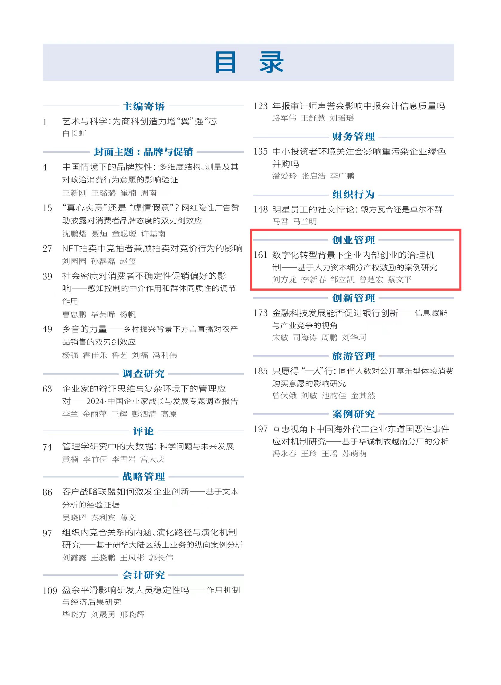 我院刘方龙老师作为第一作者撰写的论文“数字化转型背景下企业内部创业的治理机制——基于人力资本细分产权激励的案例研究”在管理学顶级期刊《南开管理评论》2024年第7期刊发。