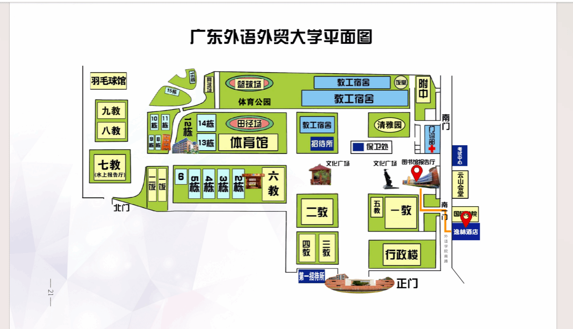 (3)出租车:直接打车前往,车程约40分钟,导航至“广东外语外贸大学白云山校区”。